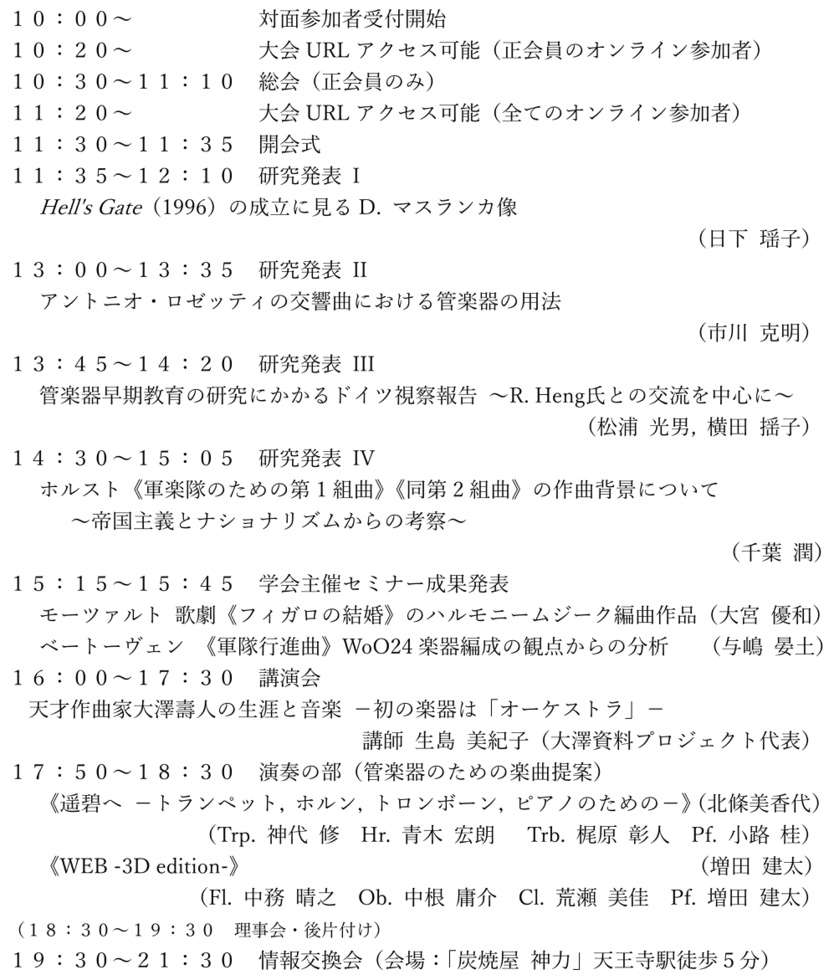 先日お知らせした第8回全国大会(大阪・一部オンライン併用)について、詳細が決定しましたのでお知らせします。より多くの方々にご参加いただけますよう、対面・一部オンライン併用としております。会員でない方の参加も可能ですので、管楽芸術に興味をお持ちの方へ周知いただければ幸いです。